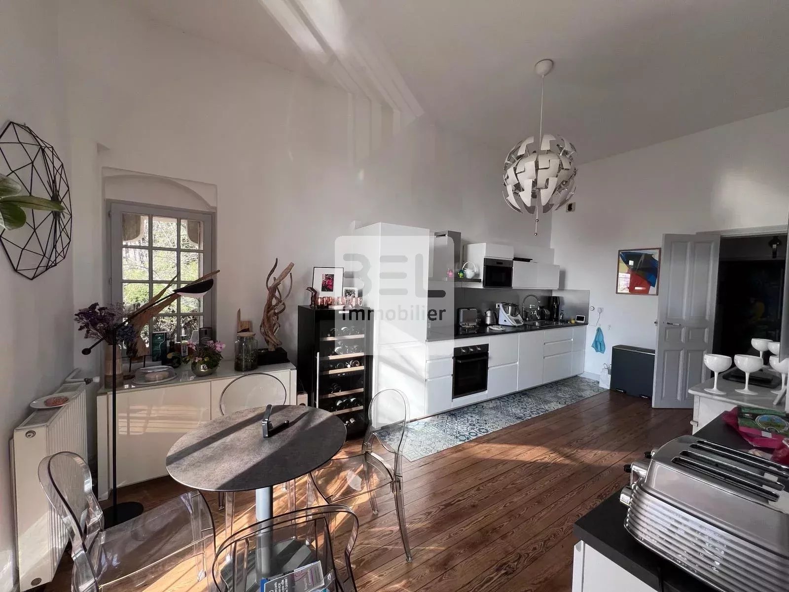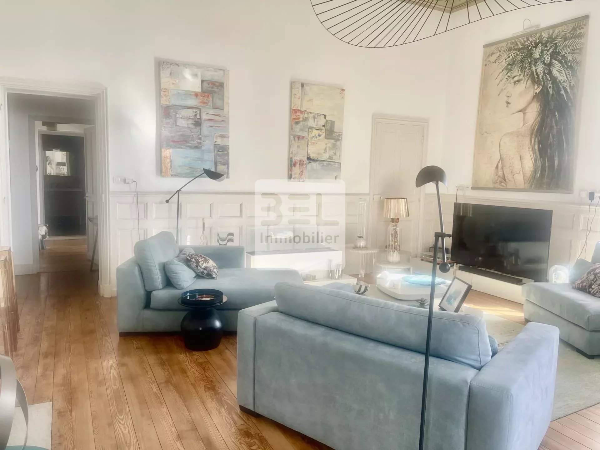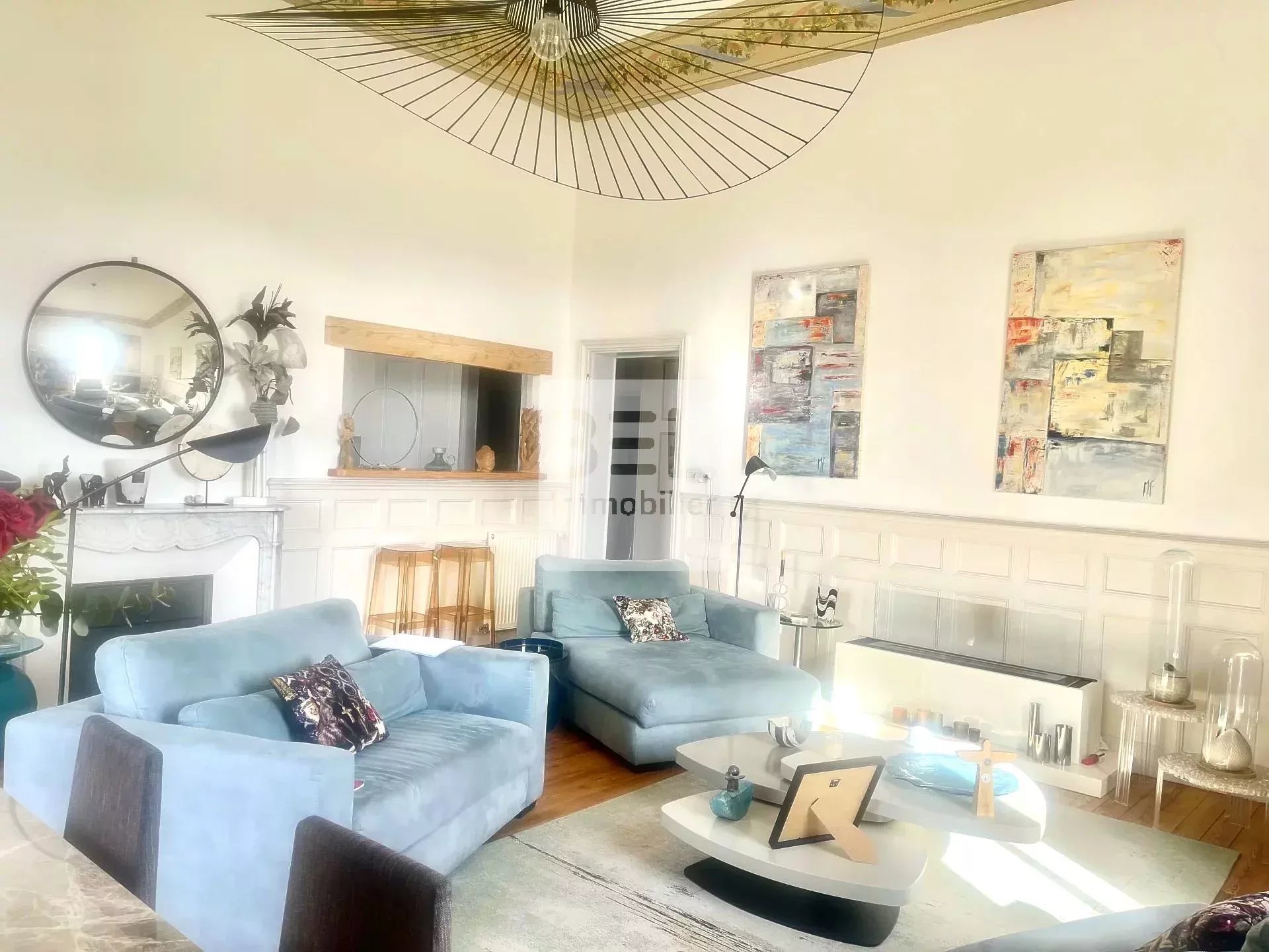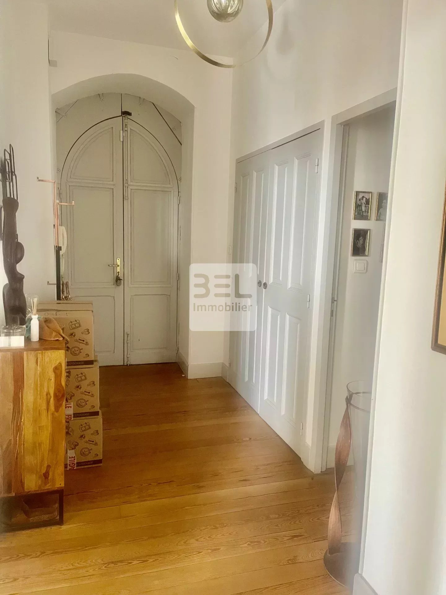 L'appartement, tout en parquet, est très lumineux. Il comprend une grande cuisine équipée, un beaux séjour avec moulures et une hauteur de plafond à 5,5 mètres. De nombreux rangements, 2 grandes chambres et une salle de bain complètent l'habitation.
