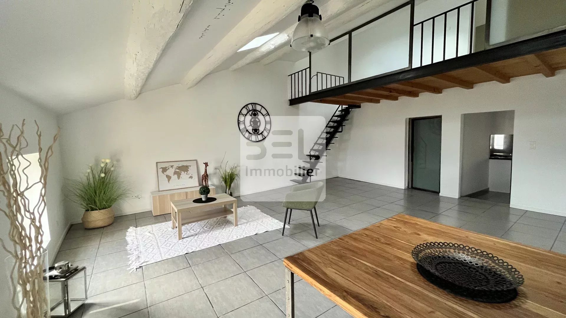 Ces beaux volumes proches de 90 m2 environ, lui confèrent au 1er niveau, une superbe pièce à vivre avec une très grande hauteur de plafond, une cuisine indépendante , une suite avec salle d'eau, des toilettes séparés.