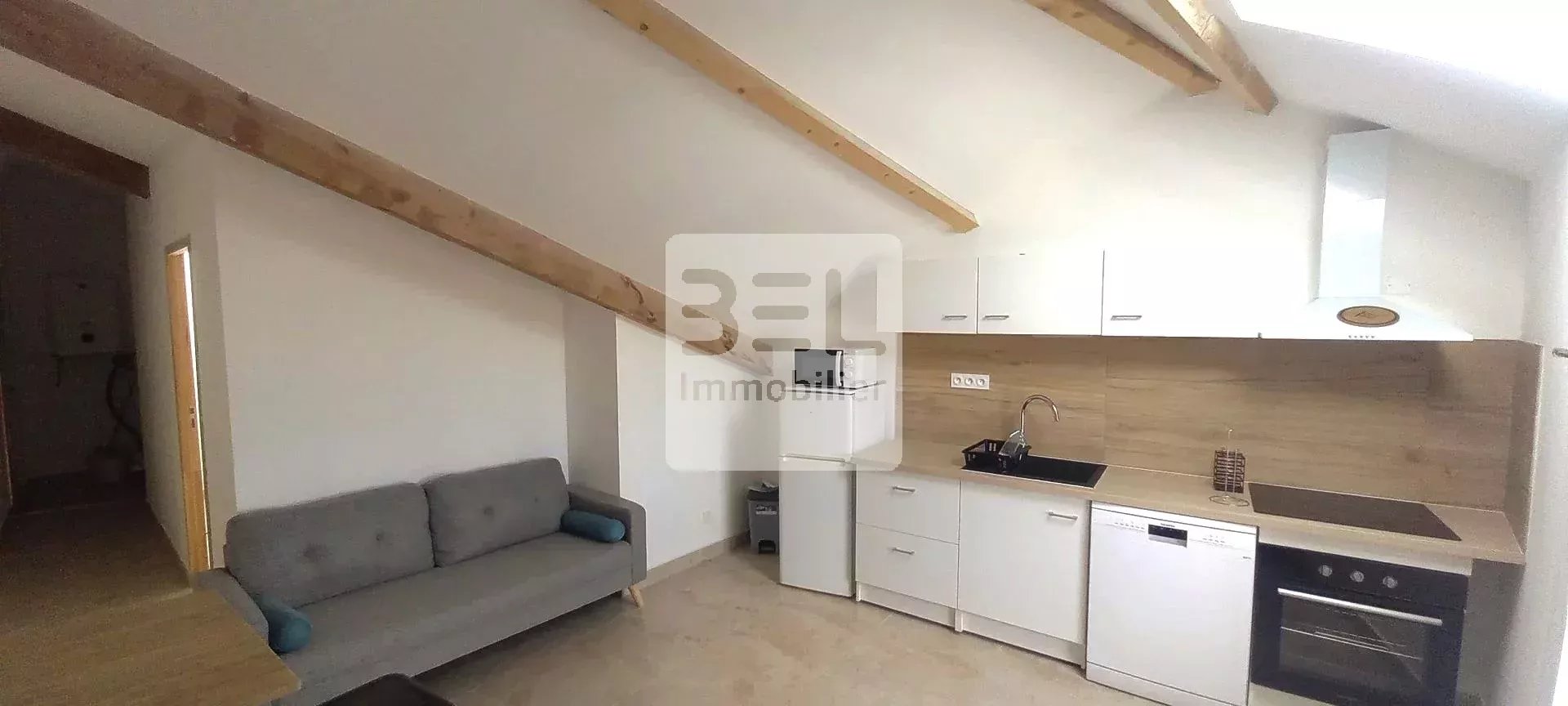 Ce logement, bien agencé, offre un cadre de vie idéal pour ceux qui souhaitent profiter du charme des combles tout en bénéficiant de la praticité d'un appartement moderne. La pièce à vivre, spacieuse et fonctionnelle, s'ouvre sur une cuisine aménagée et équipée.