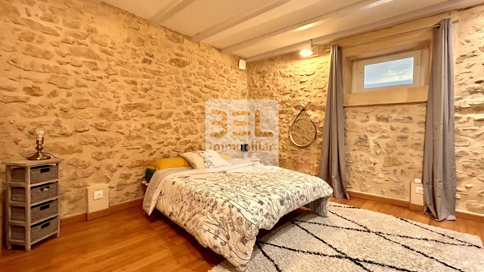 Côté nuit, vous découvrirez une charmante chambre aux murs en pierre de 17 m² offrant un grand espace pour le dressing. Vous trouverez également une seconde chambre de 11 m² et une salle de bain avec toilettes.