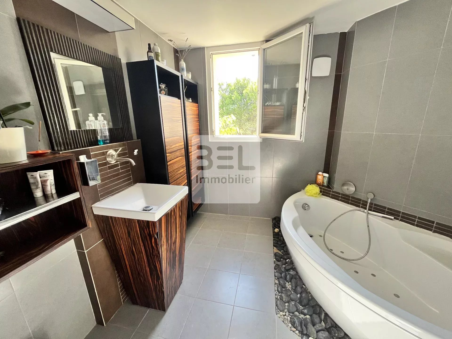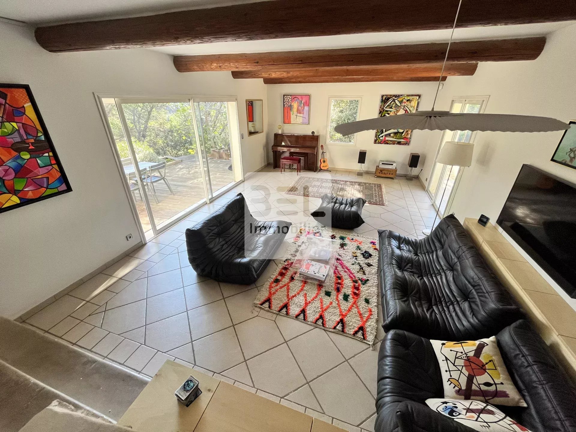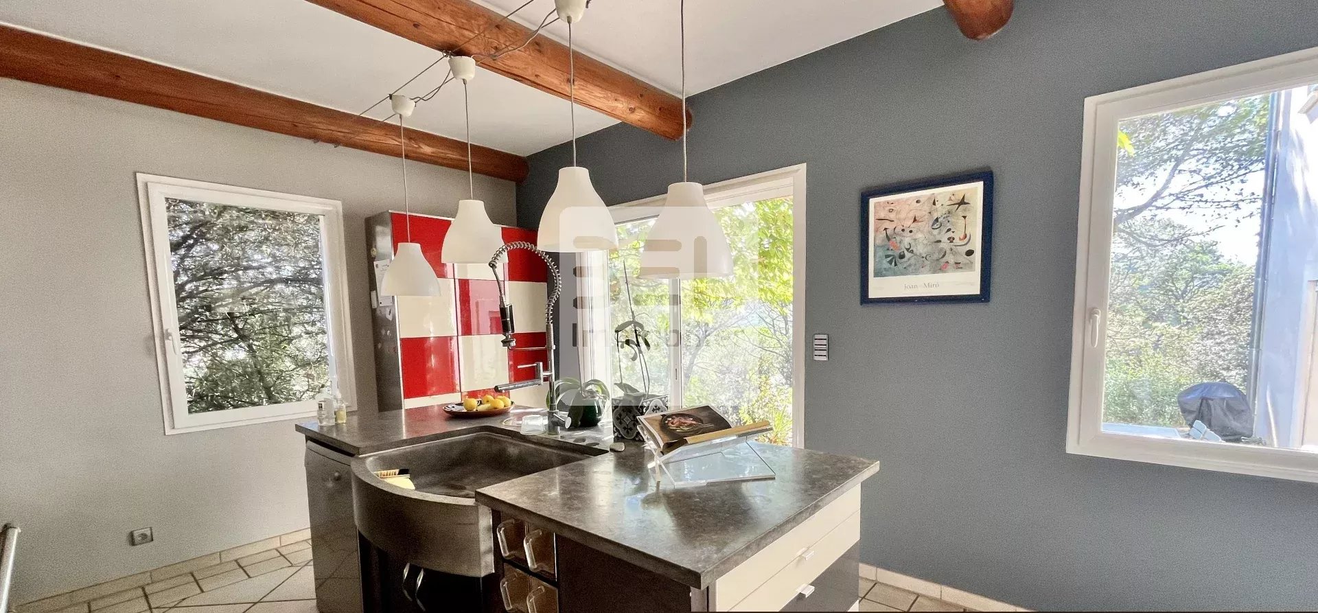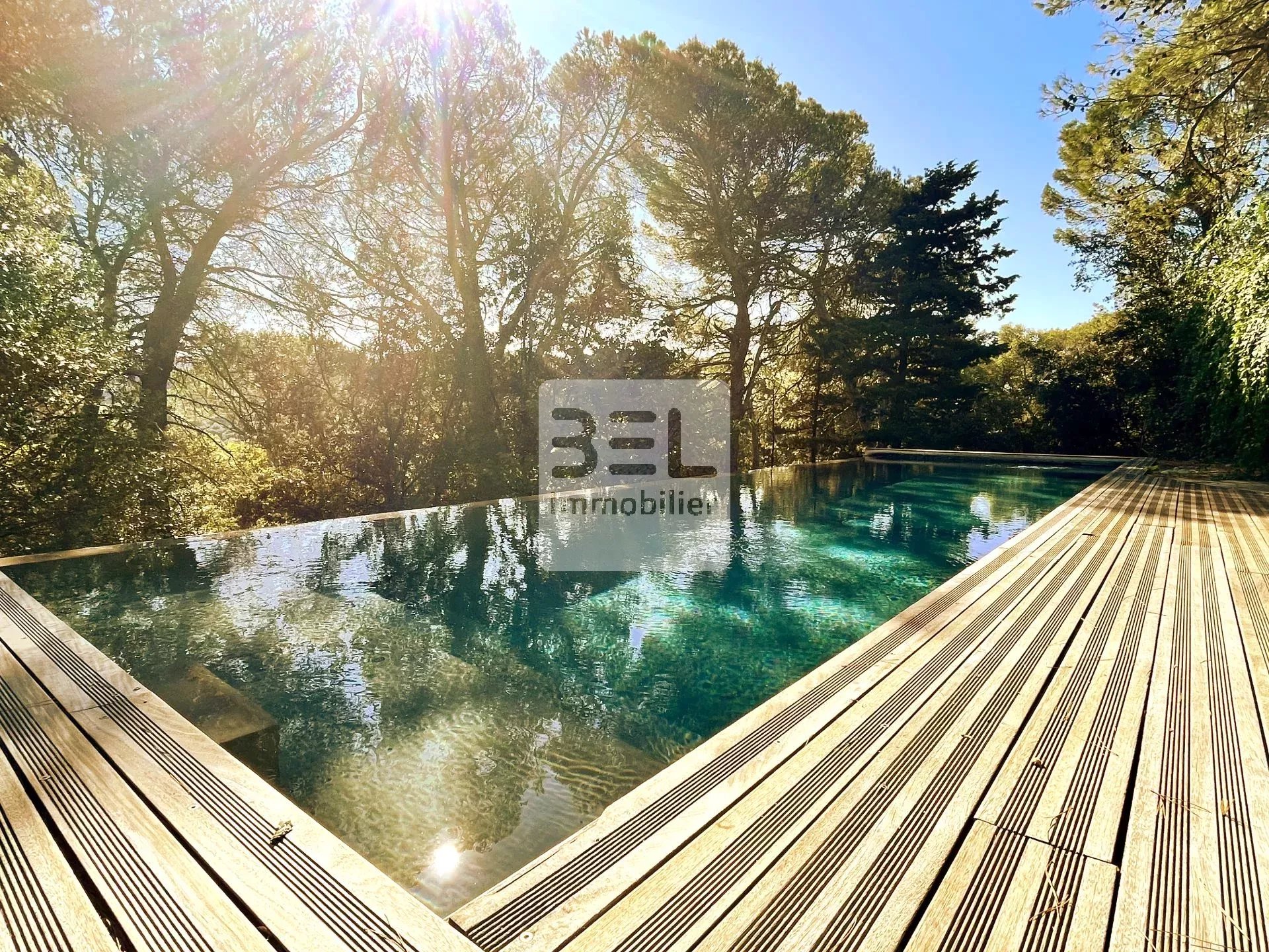 À l'extérieur, la piscine à débordement chauffée, avec sa vue boisée sur les restanques, crée une atmosphère de quiétude à couper le souffle. La propriété comprend également un cellier/buanderie, une cave et un abri voiture, complétant ainsi cette magnifique villa.