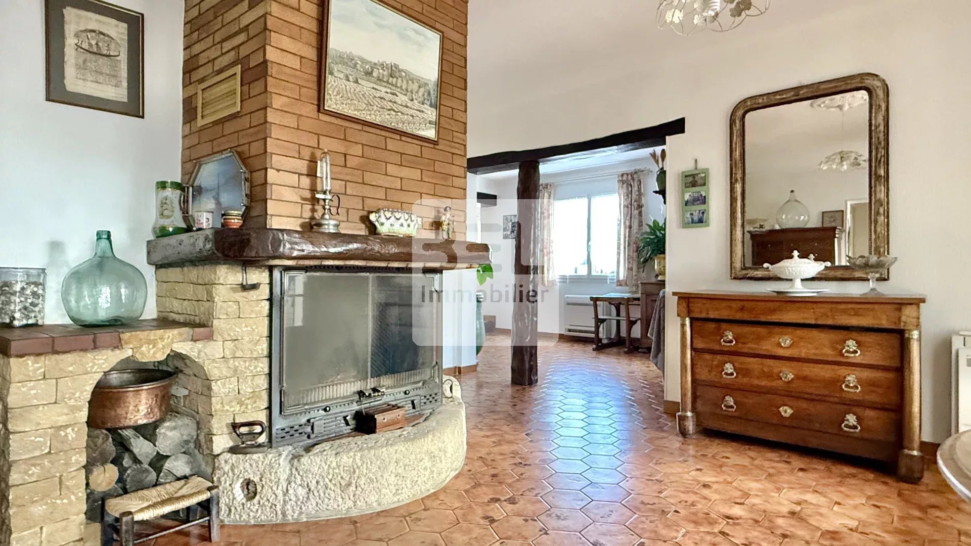 L'espace de vie est composé d'un salon ouvert sur la salle à manger avec une cheminée et deux climatisations pour vos journées d'été. La cuisine donne accès directement à la terrasse. Vous profiterez également d'une véranda lumineuse et d'une charmante cuisine d'été.