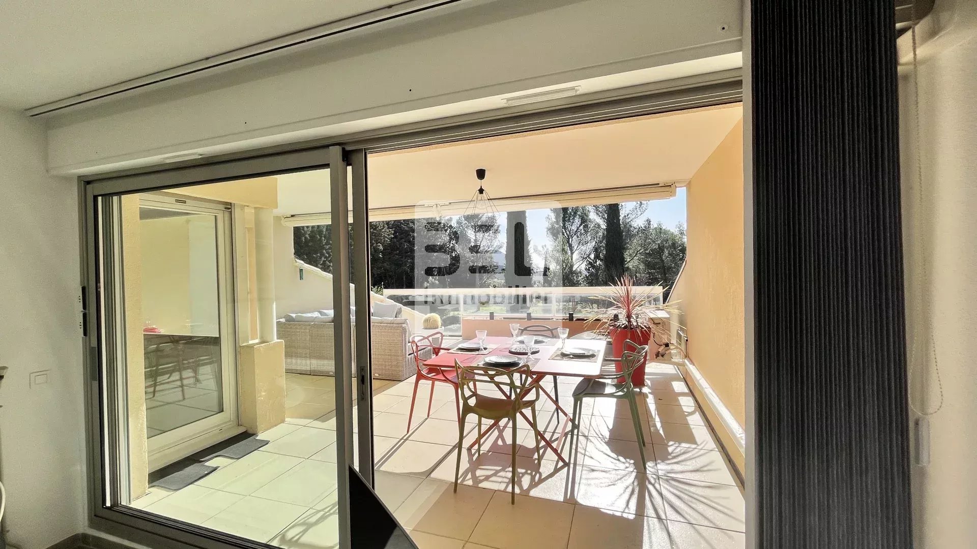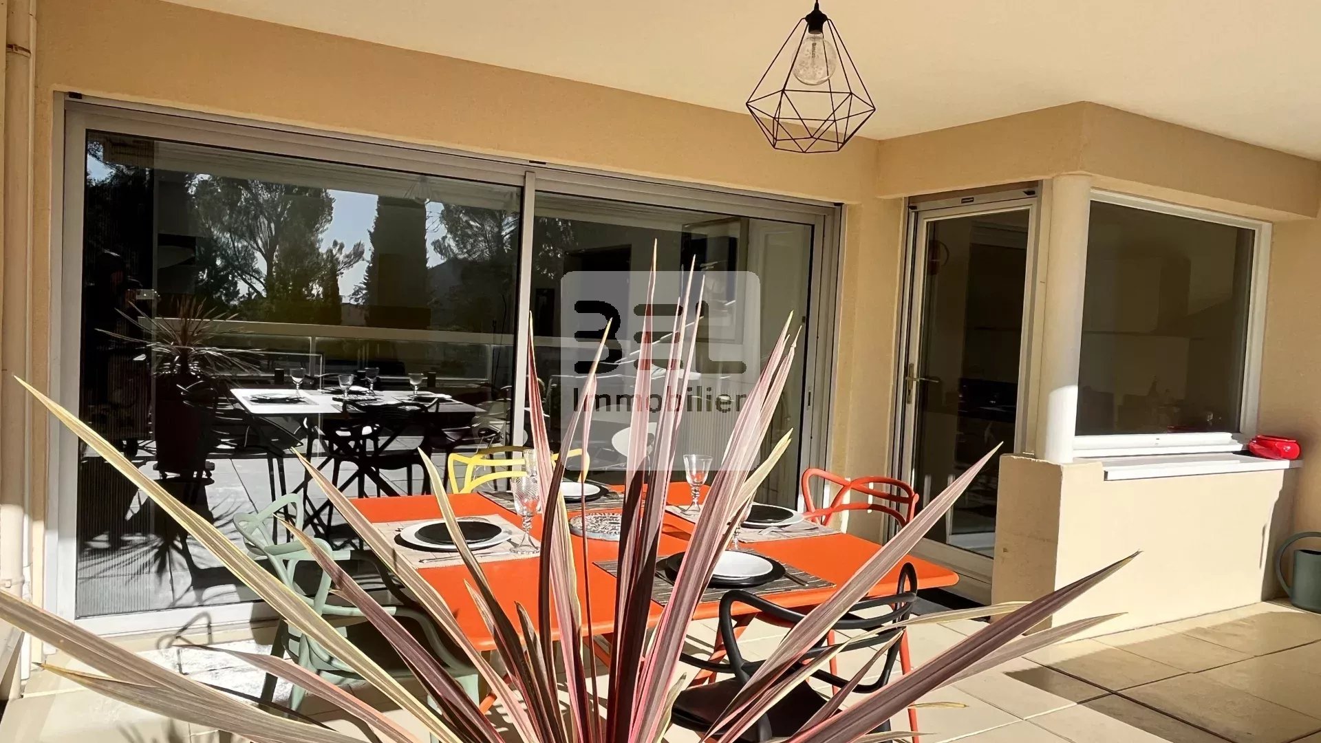 Exposé plein sud, la très grande terrasse sans vis à vis avec vue panoramique sur le parc de la résidence, sera le point central de cet appartement.