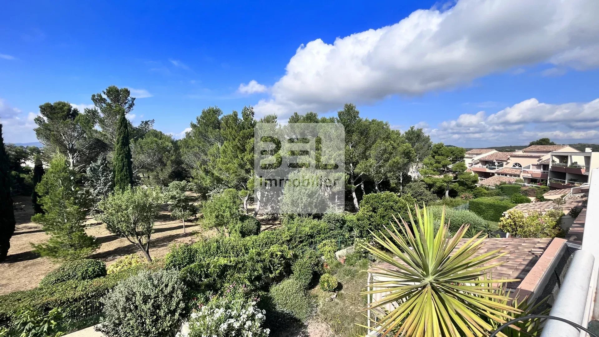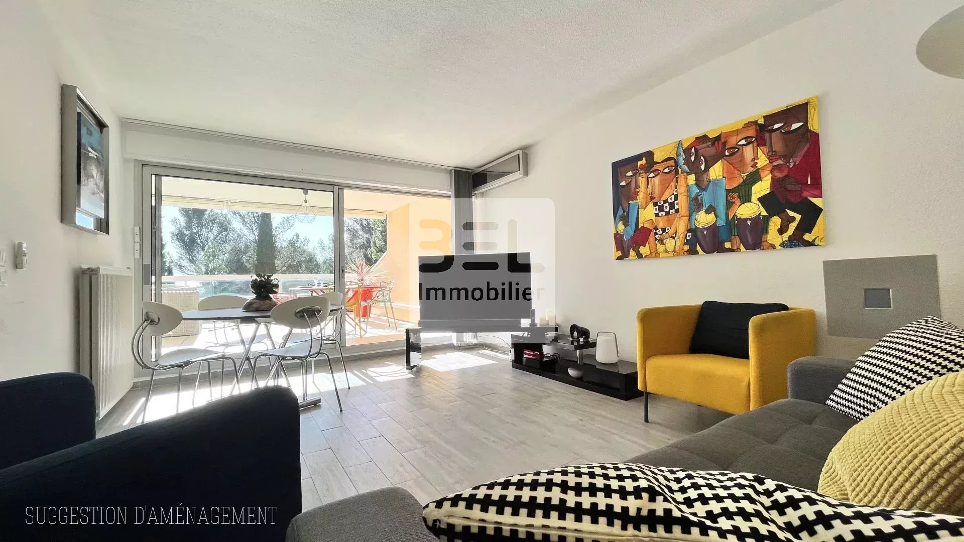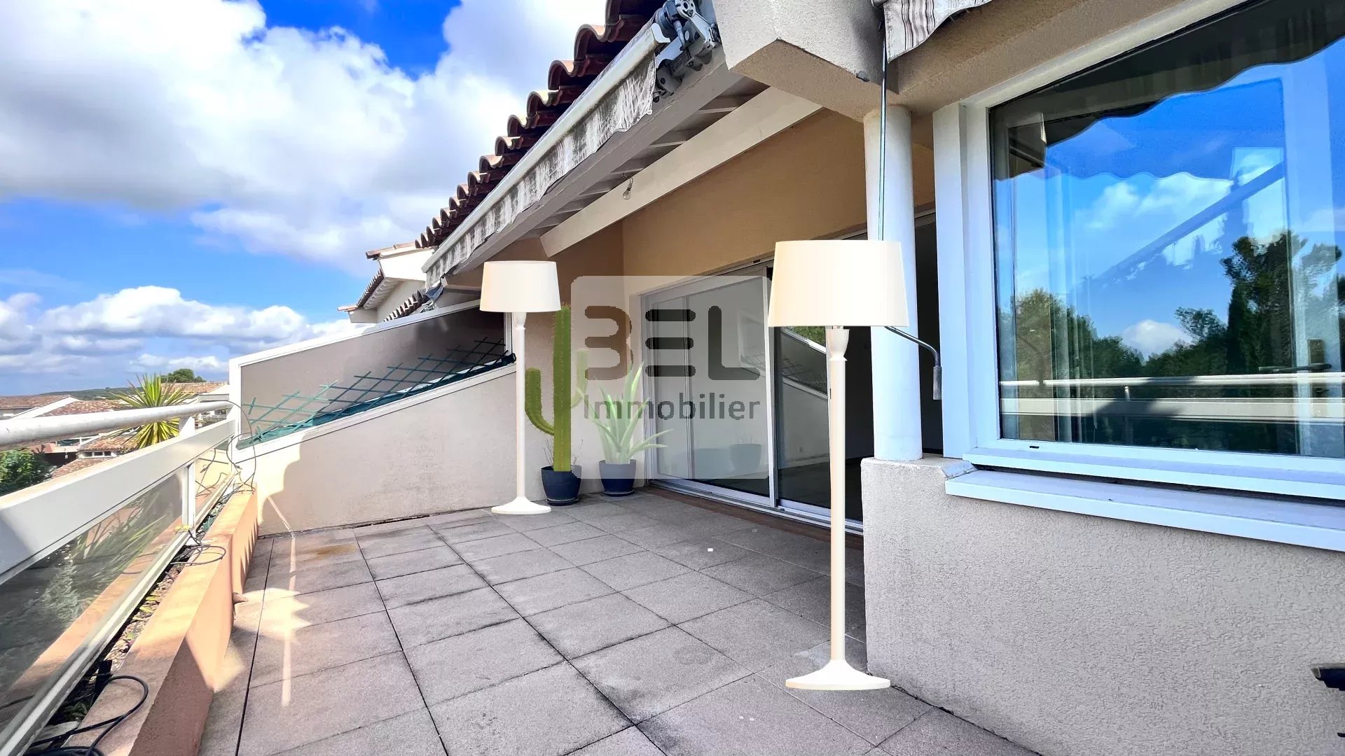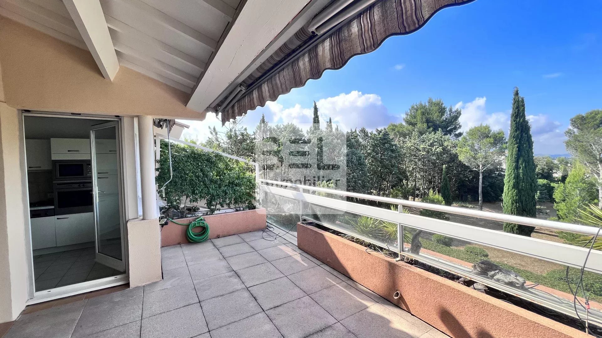 Exposé plein sud, la grande terrasse sans vis à vis avec vue panoramique sur le parc de la résidence, sera le point central de cet appartement.