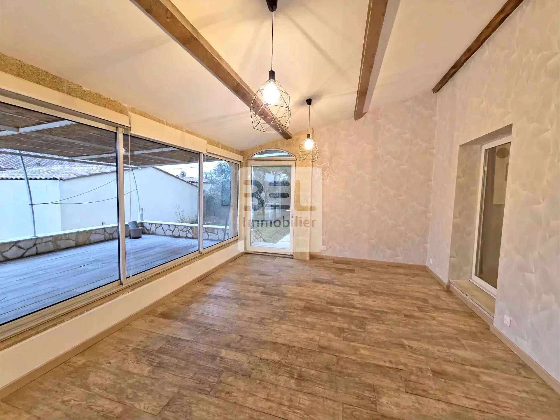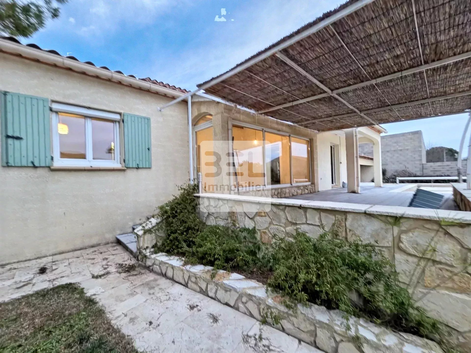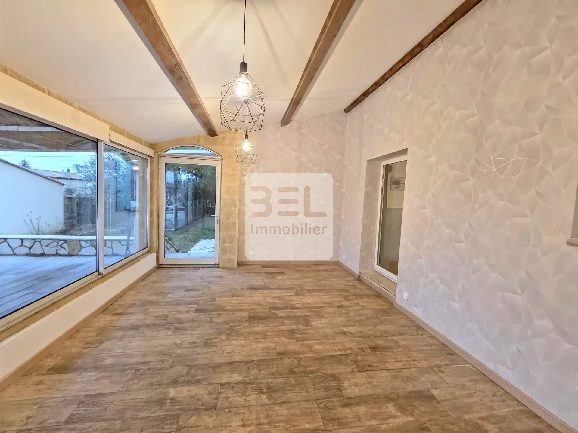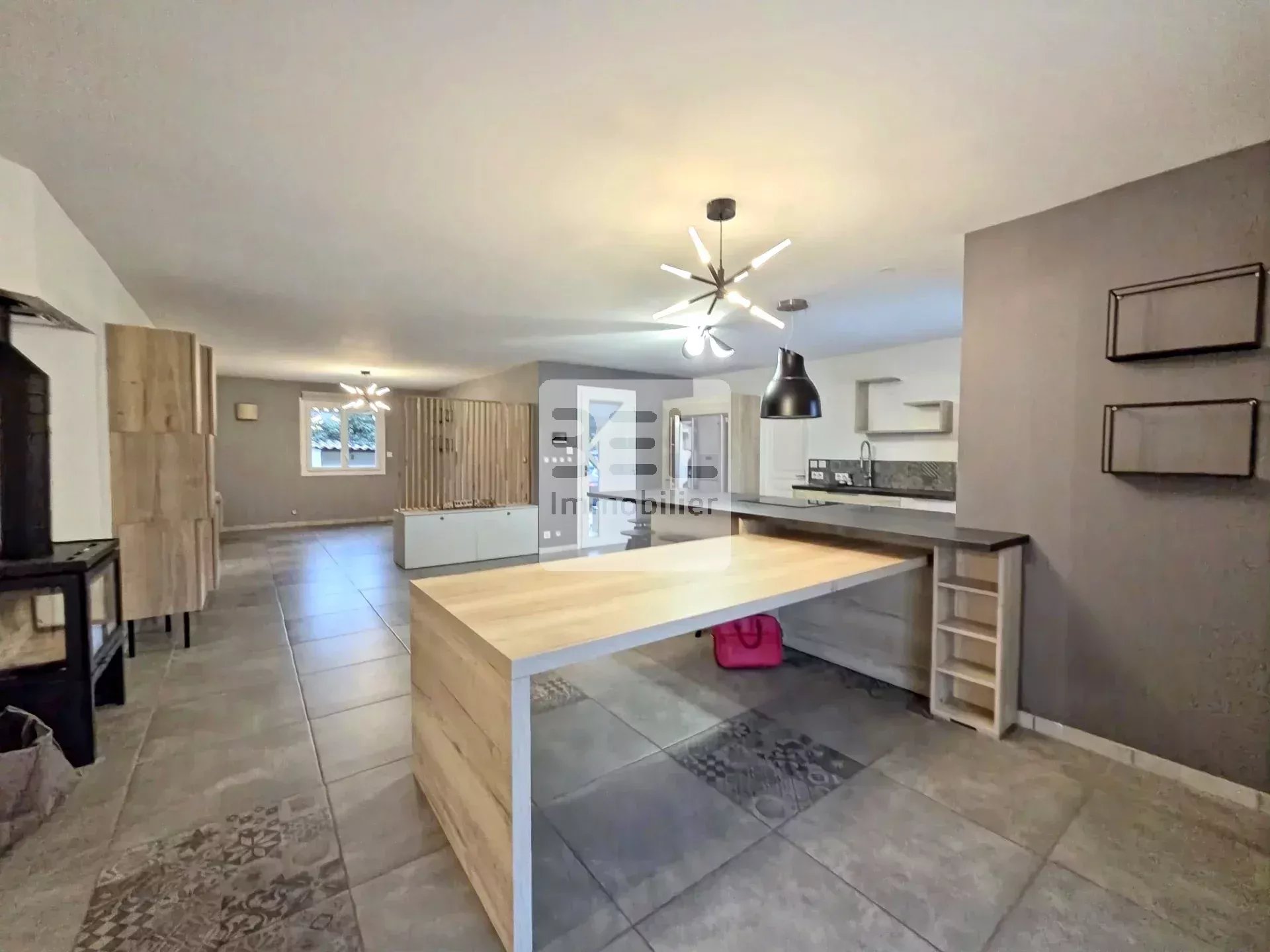 La villa dispose d'une grande terrasse couverte, parfaite pour profiter des journées ensoleillées ou des soirées d'été. L'extérieur en pierre ajoute du caractère à la propriété, et le jardin offre un espace agréable pour se détendre avec sa piscine maçonné dotée d'un revêtement en mosaïques. L'agencement intérieur est conçu pour maximiser l'espace tout en offrant une ambiance chaleureuse et accueillante.
