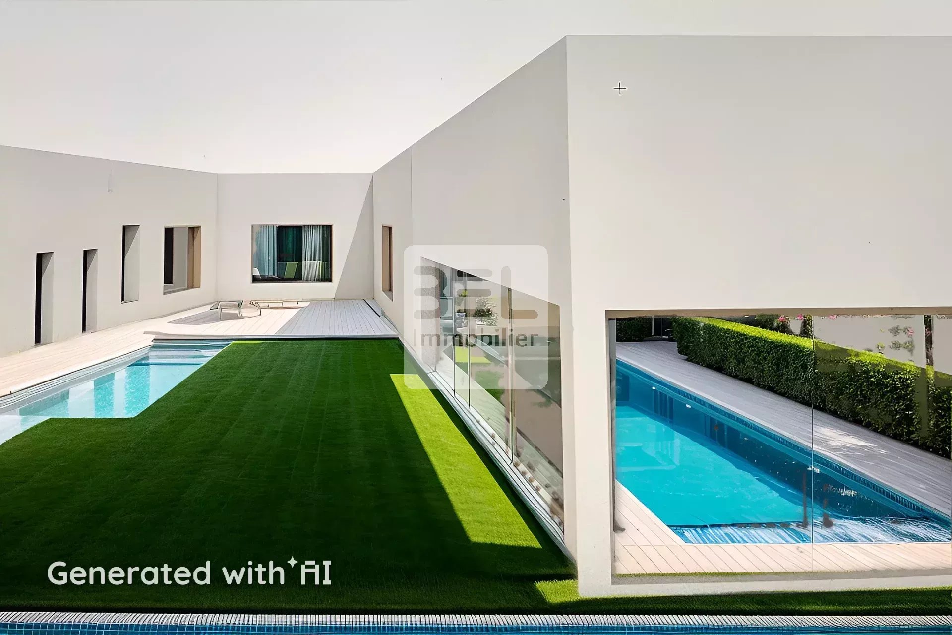 des menuiseries en aluminium de couleur gris anthracite avec volets roulants. des façades réalisées en enduit taloché fin " ton pierre ". une piscine de 6 X 15 mètres fermée et chauffée. une terrasse en bois. un spacieux garage de 43 m2. un portail automatique avec visiophone. une clôture et des palmiers.