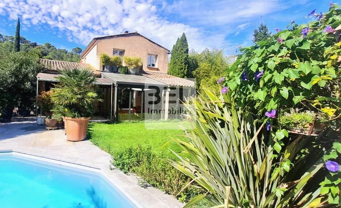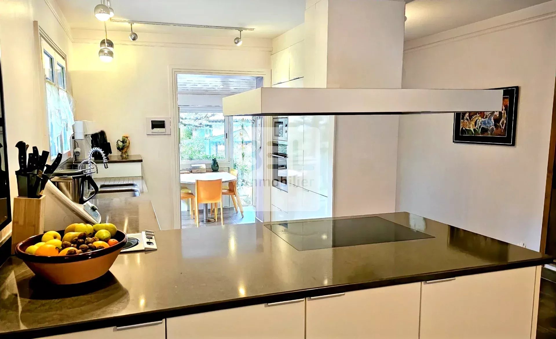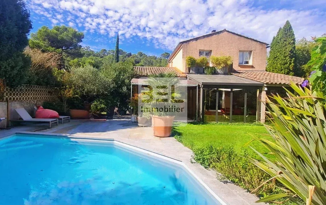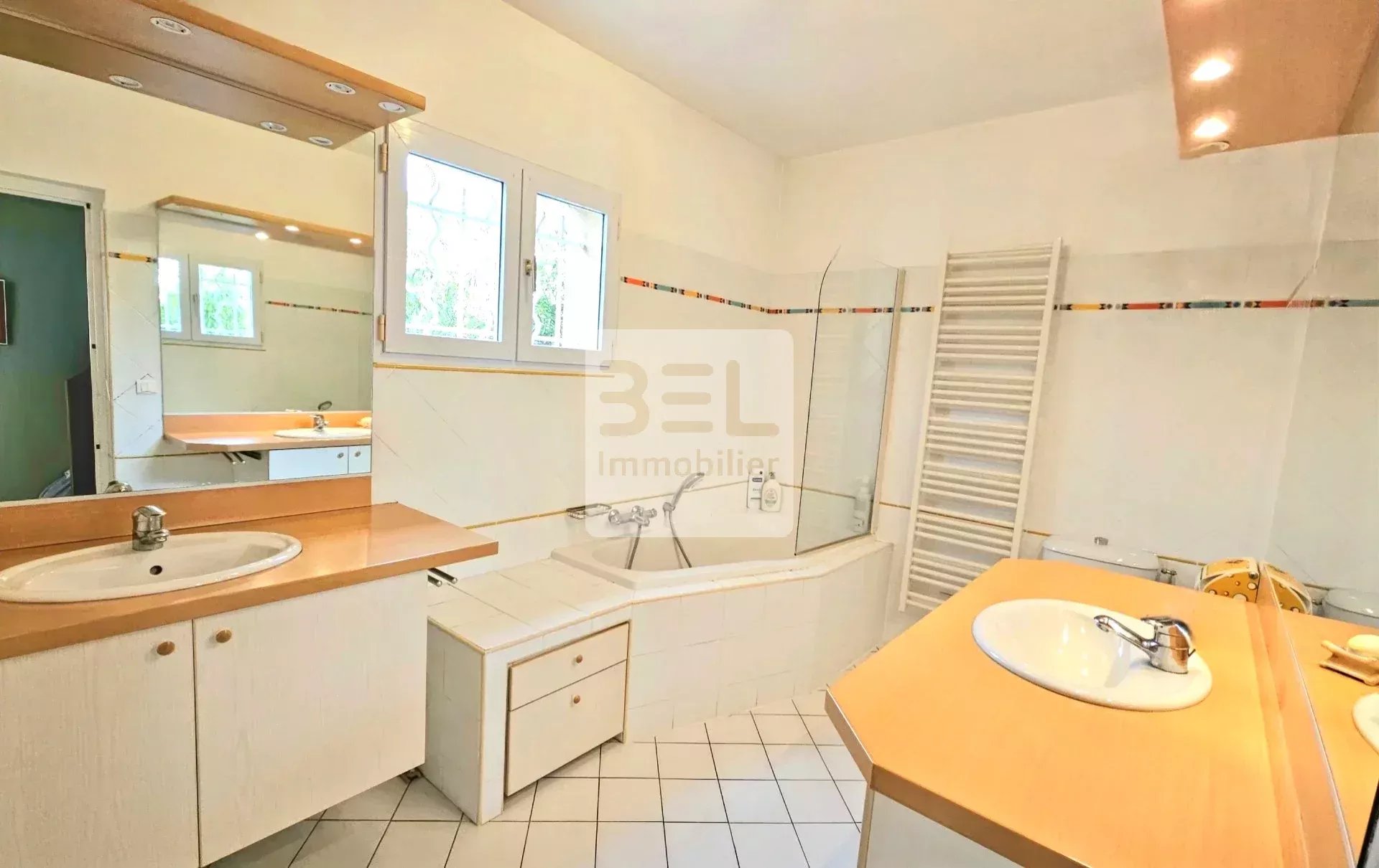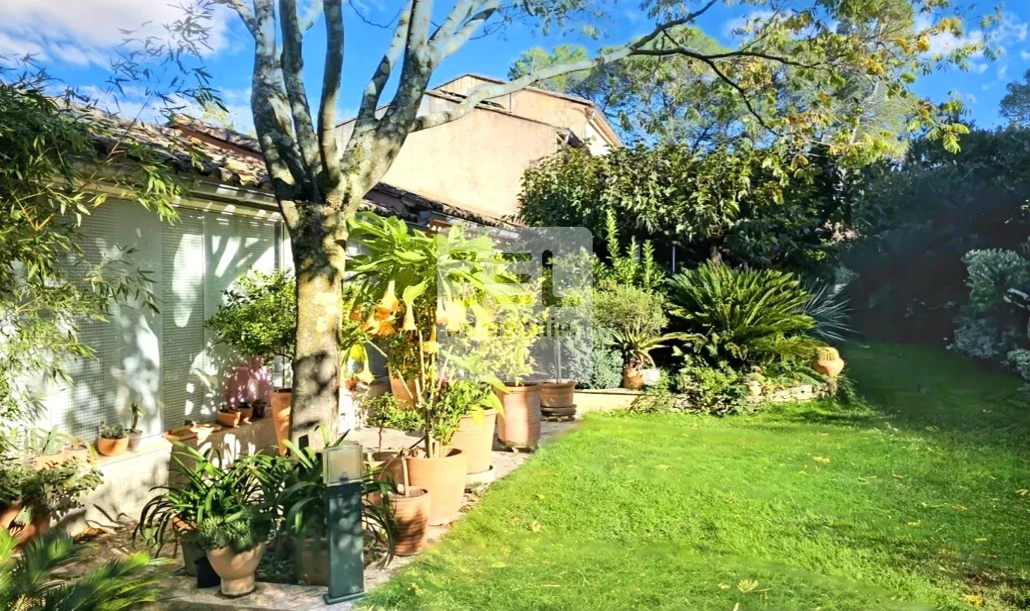 Implantée sur un terrain d'environ 1 200 m² magnifiquement arboré, la propriété dispose d’une très belle piscine chauffée, parfaitement intégrée au jardin.