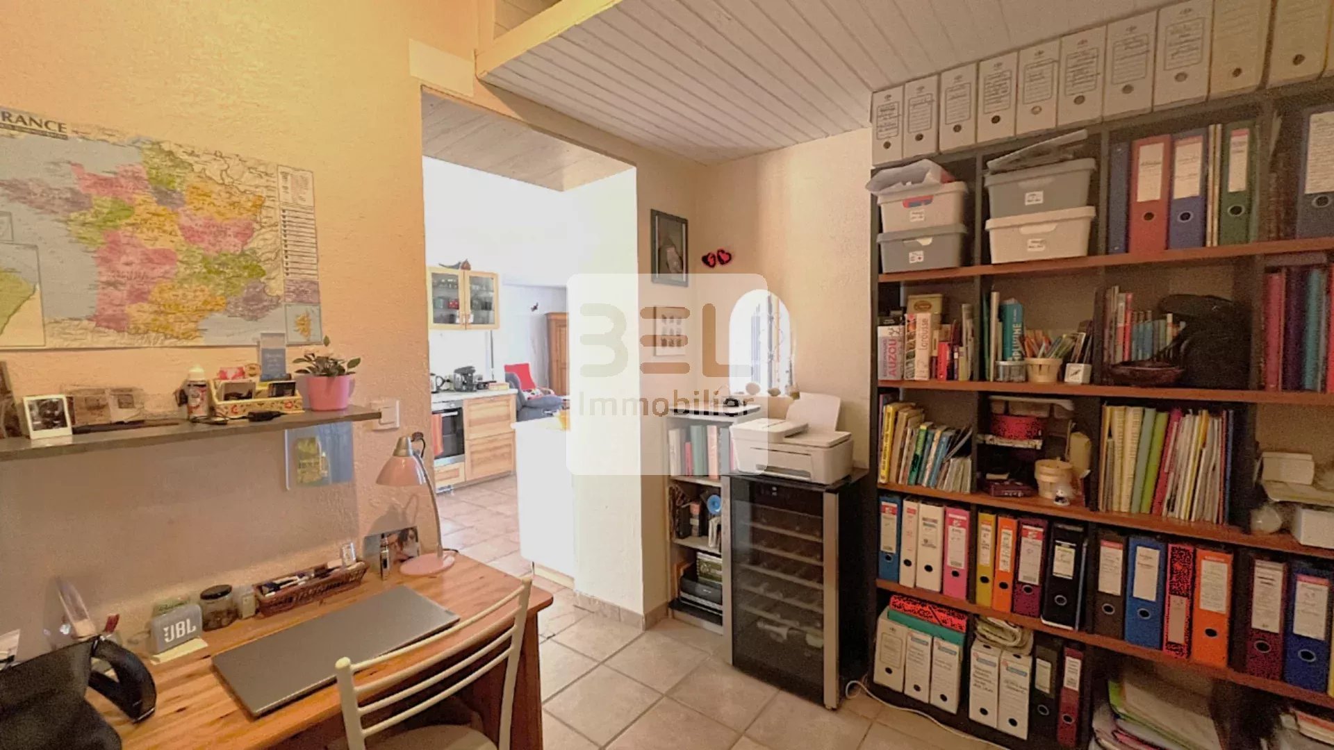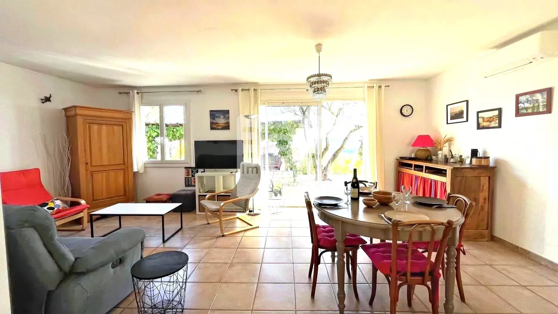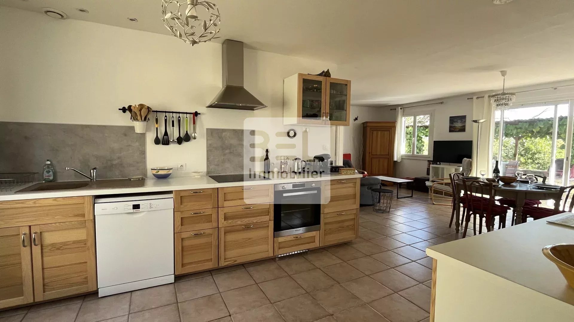 Très fonctionnelle, cette maison propose une entrée qui dessert un salon séjour ouvert vers sa cuisine.