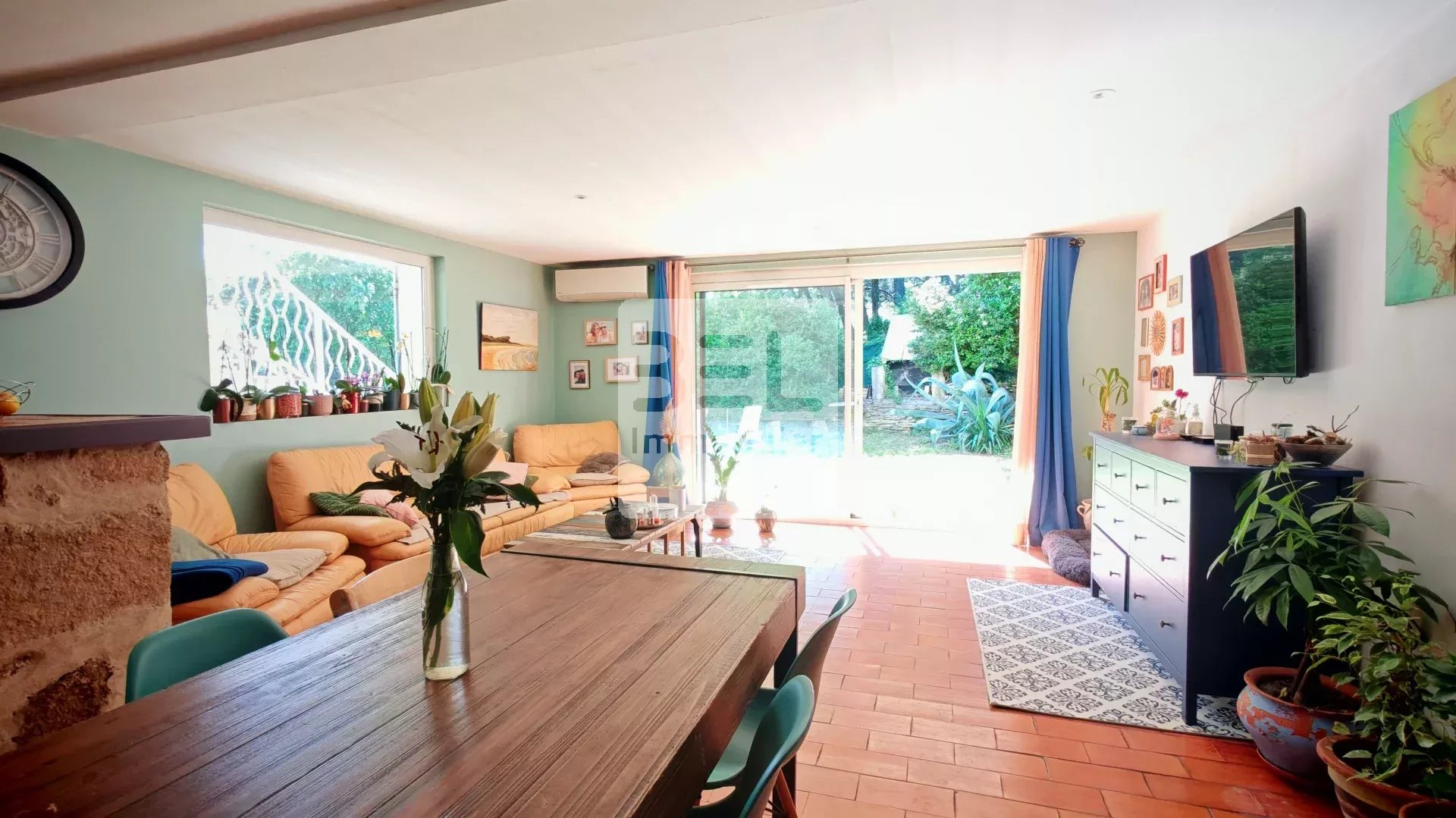 Vous jouirez d'un espace lumineux au centre de la verdure grâce à sa grande baie vitrée sur mesure donnant sur le jardin et coin barbecue.