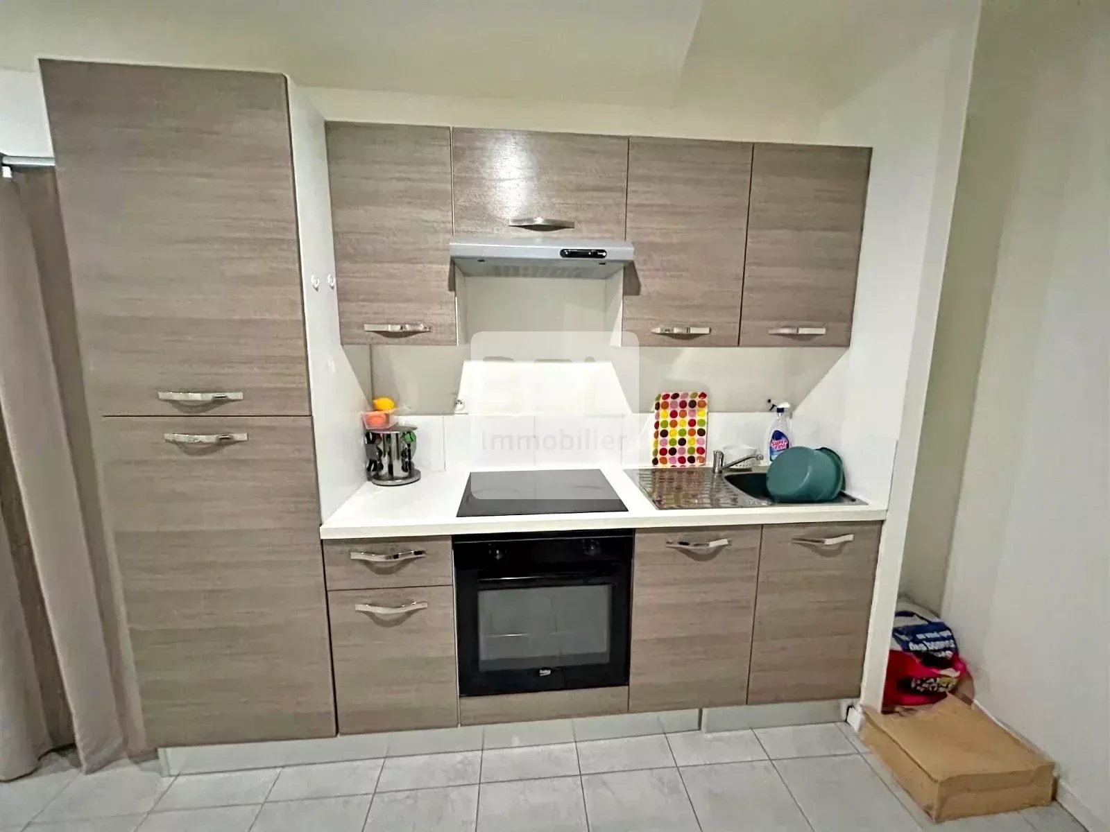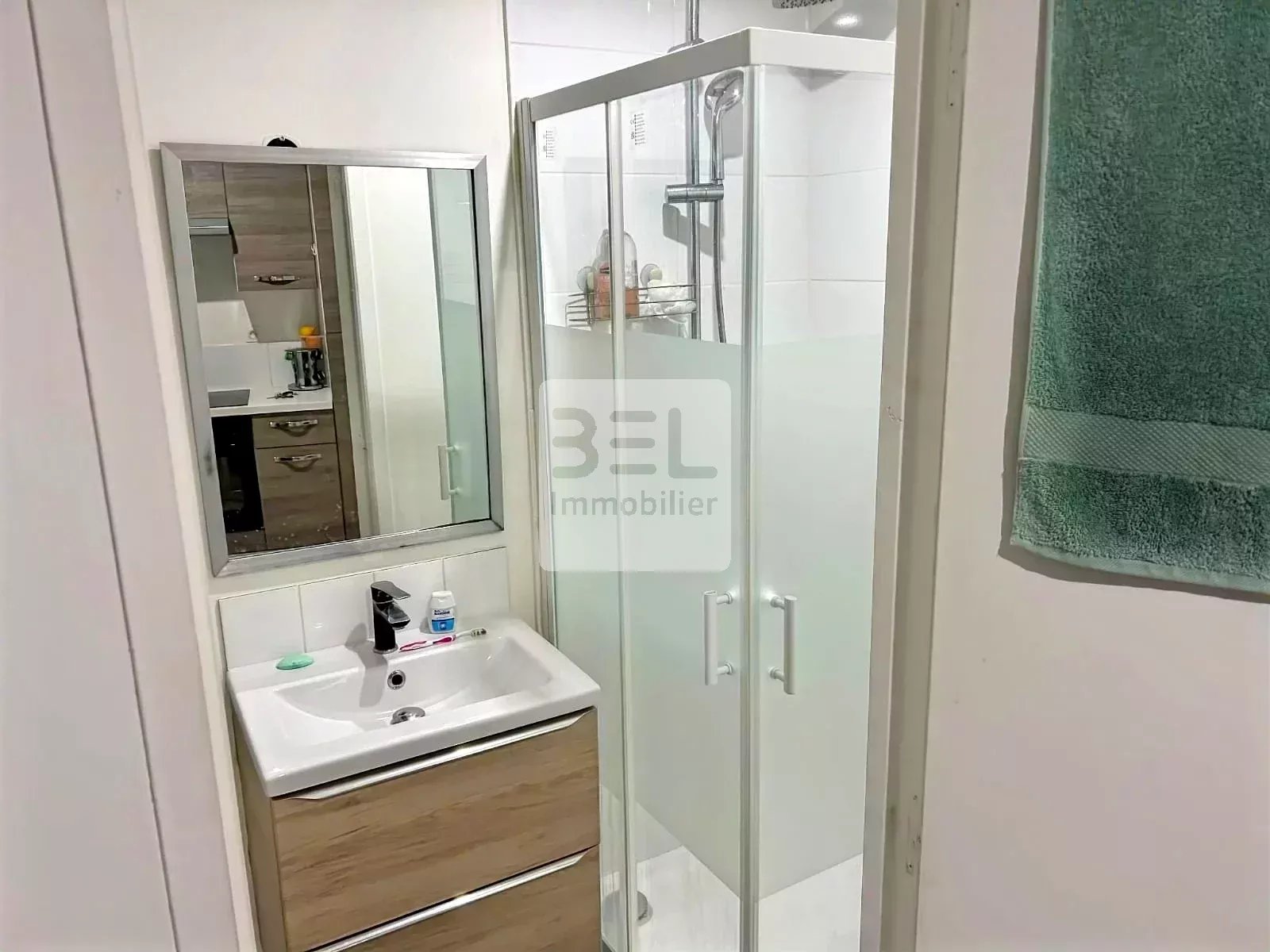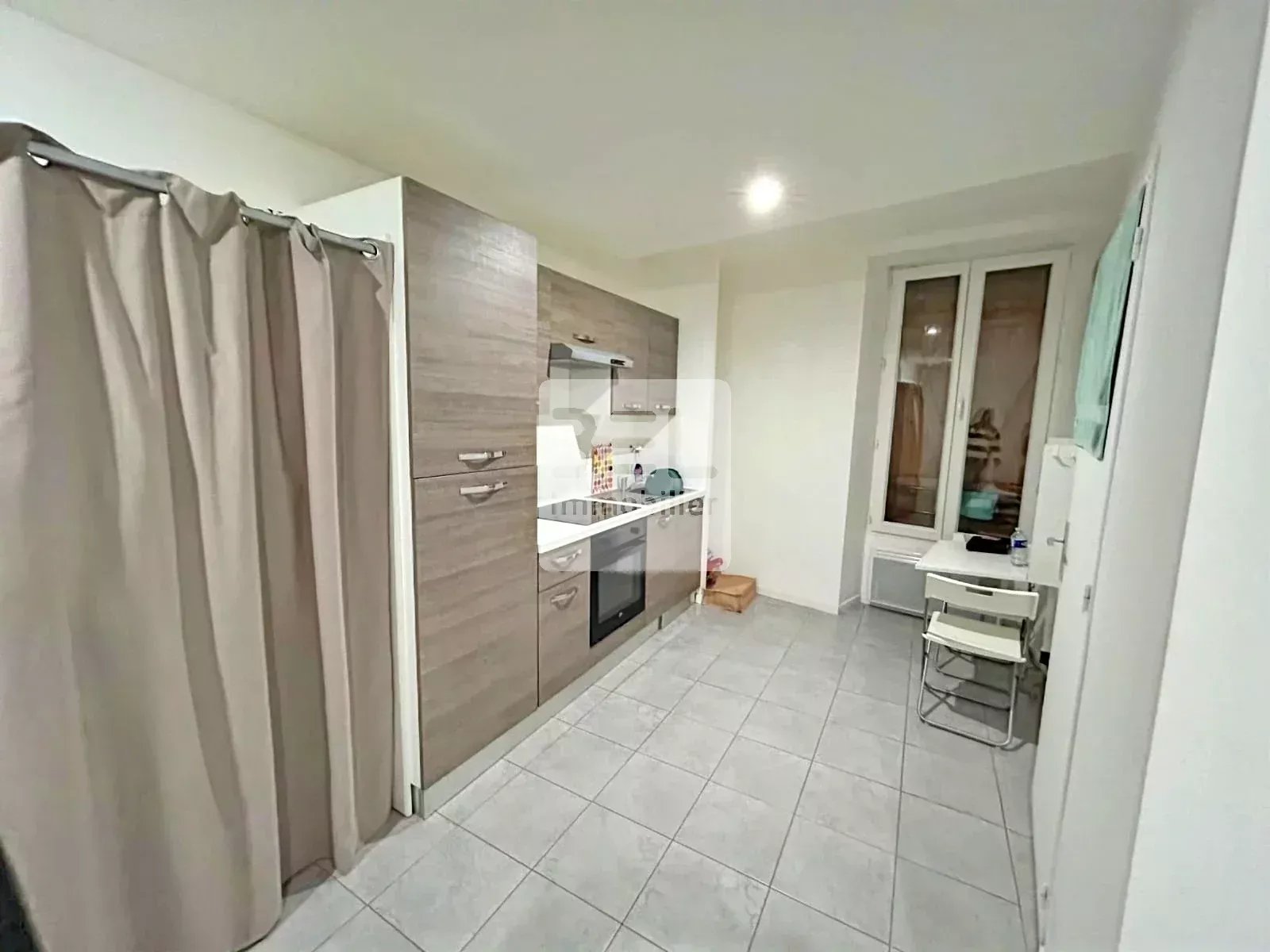 Studio meublé lumineux de 20,73 m² situé à Bagnols-sur-Cèze, comprenant une pièce de vie avec coin nuit, une kitchenette équipée et une salle d’eau moderne avec WC.