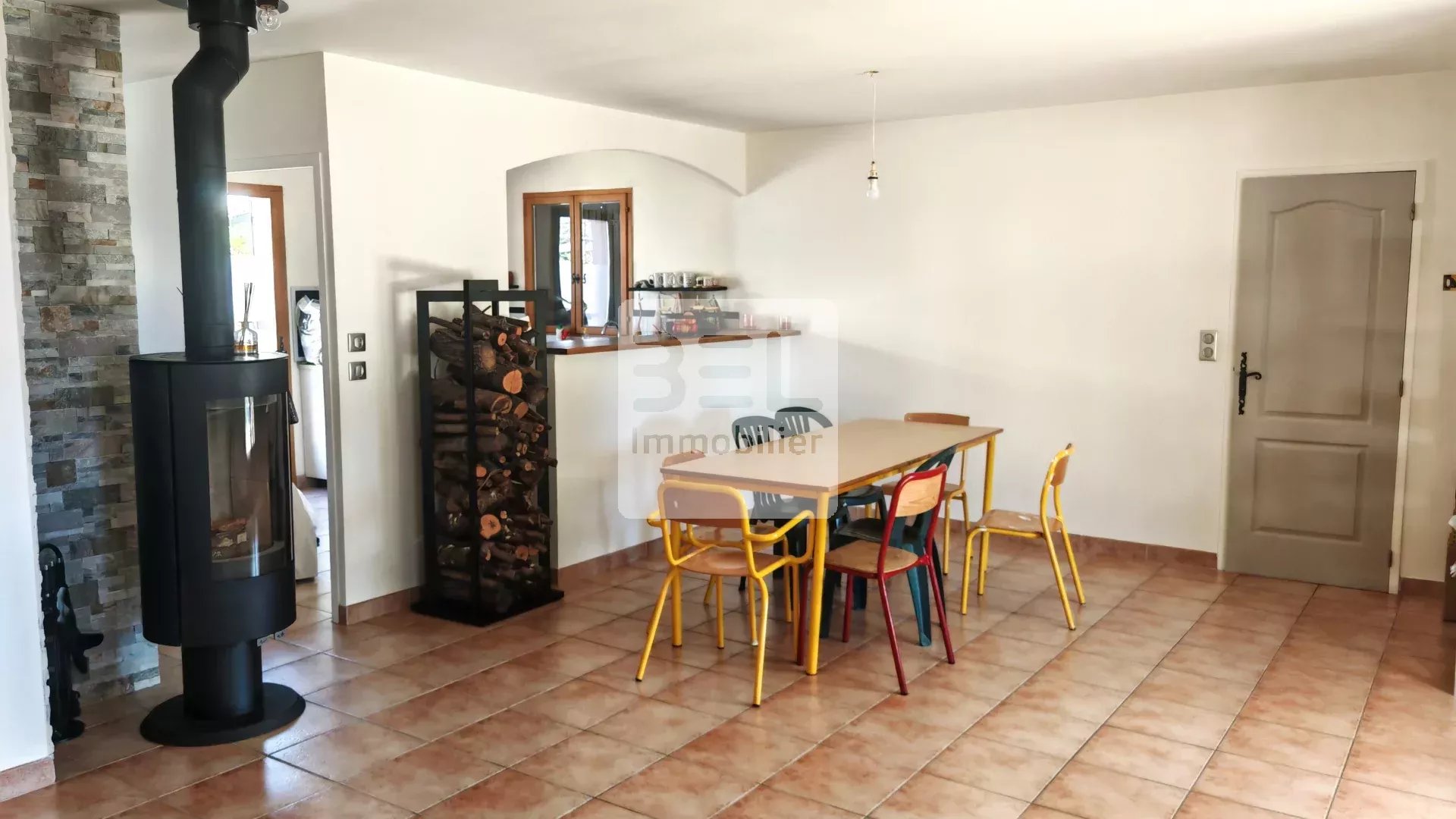 La pièce à vivre, chaleureuse et accueillante, est dotée d'un poêle à bois récent, idéal pour une assurer une chaleur uniforme dans toute la maison.